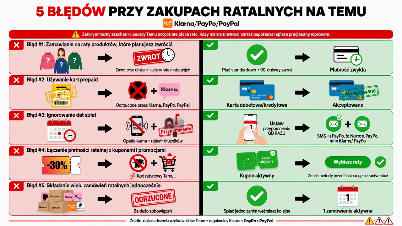 Płatność ratalna to wygodne narzędzie — ale jak każde narzędzie, można je źle użyć. Poniżej znajdziesz listę błędów, które popełniają polscy użytkownicy Temu najczęściej, oraz konkretne sposoby, jak ich uniknąć.